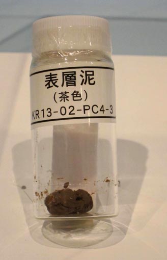 画像は、東京・国立科学博物館で開催された特別展「深海」(2013年7月7日~10月9日) において展示された「レアアース泥」の