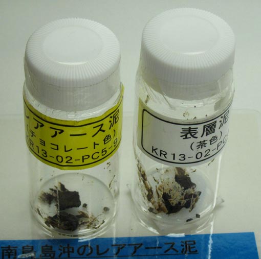 レアアース泥。レアアース泥は濃い色をしている」と記される。左:表層泥(茶色)、右:レアアース泥 (チョコレート色)