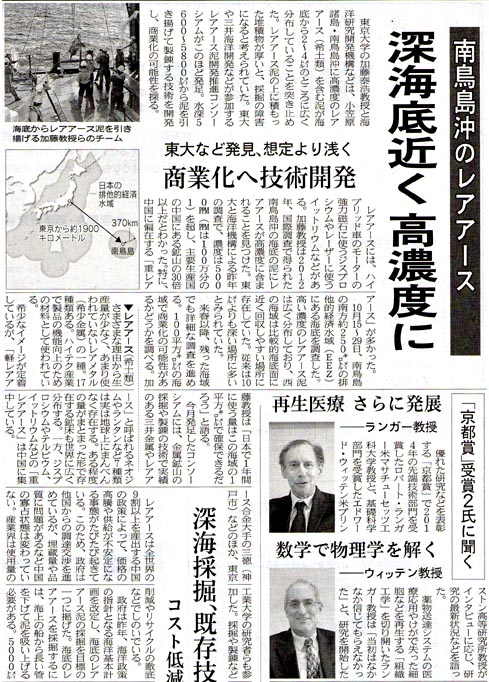 2. 日経新聞の2014 (平成26) 年11月25日付記事。東京大学加藤泰浩教授、JAMSTECなどが南鳥島沖で高濃度のレアアース (希土類)
