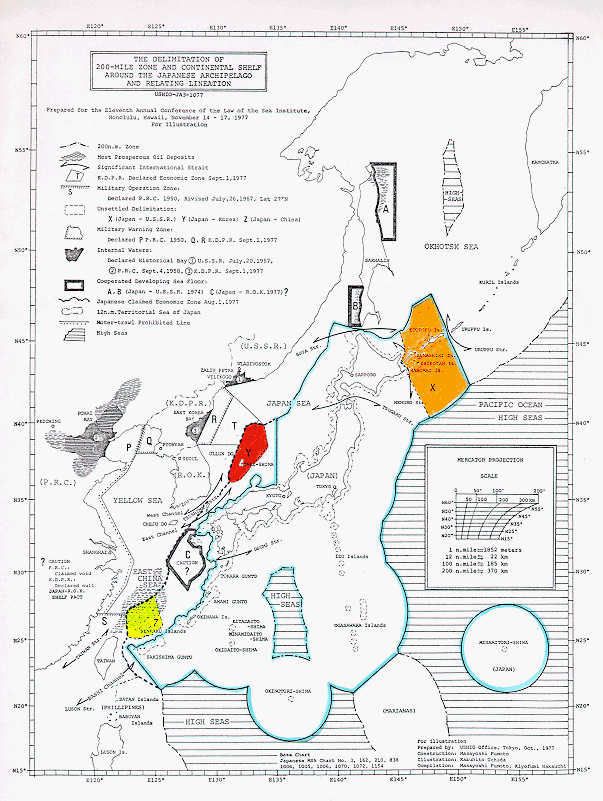 2-情況の変化: 日中韓の国連海洋法条約への加入など (1)まず、日本周辺海域での中国・韓国漁民による漁業活動はますます活発化してきた。現行制度(レジーム)の下では、 中国、韓国の漁船は、日本の12海里領海外側の限界線ぎりぎりの沿岸水域で操業することがますます多くなってきた。 その場合、日本が制定した国内漁業規制に従うべき法的義務はない。他方、日本の漁船は、12海里領海外の沿岸水域 であっても、水産資源保全のためのさまざまな国内漁業規制の下で操業してきた。 このため、日本の沿岸漁民はその不条理に不満を募らせてきた。また、水産資源の保全措置を実効性の乏しきものに してきた。12海里領海の外側である限り、中韓の違反漁船に対する取り締まり権は旗国である中韓にあり、日本には 確保されてこなかったからである。 このように、日本としては、沿岸水域での漁業権益保護や水産資源保全(乱獲による資源枯渇の防止)を図るためには、 200海里排他的経済水域(Exclusive Economic Zone=EEZ)を設定するか、新たな日中漁業協定を締結するなどして、 現行の特例措置に起因する諸問題を早期に払拭するとの必要に迫られてきた。 (2)第二に、日本は1996年6月20日に、中国は同年6月7日に、及び韓国は同年1月29日に、国連海洋法条約(UNLOS条約) を批准した。これによって、日中韓3国は200海里EEZを設定しても互いに対抗できる立場を確保するとともに、 その境界線の画定交渉につく共通基盤をもつに至った。 このように、日本は、他国漁船からの自国沿岸漁民の権益保護、沿岸水産資源の保全を十分図るべく、EEZの境界線画定、 更に新漁業協定の締結につき、中国・韓国と合意を目指して交渉してきた。