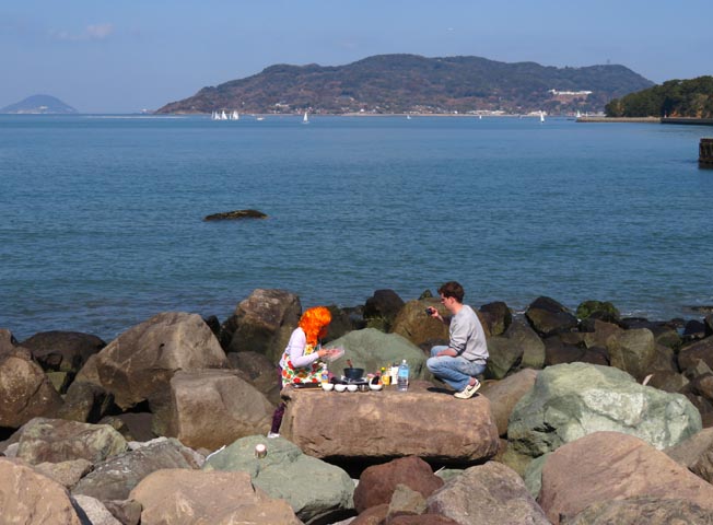 天気は快晴で穏やかな、制作には絶好の日和であった。背後の博多湾に浮かぶのは「能古島」。Tom & Roisin両名の許可を得て撮影した