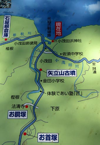 「元寇の古戦場(佐須浦)」と題する小茂田浜神社(こもだはまじんじゃ)の案内板には次のように記される。画像5の古戦場周辺地図