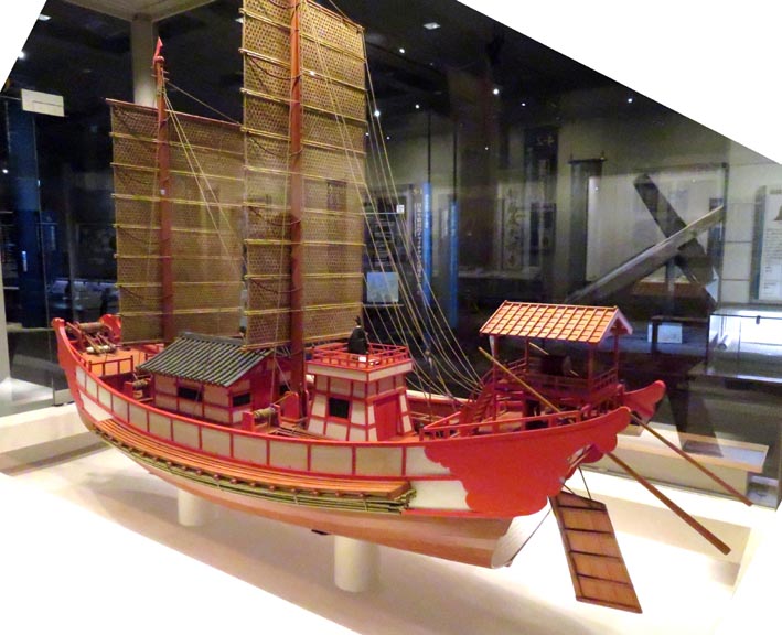 画像1・2は遣唐使船の模型(縮尺1/10)である。展示説明パネルによれば、「鎌倉時代の絵巻物、近年発掘された宋や元の船を手がかり
