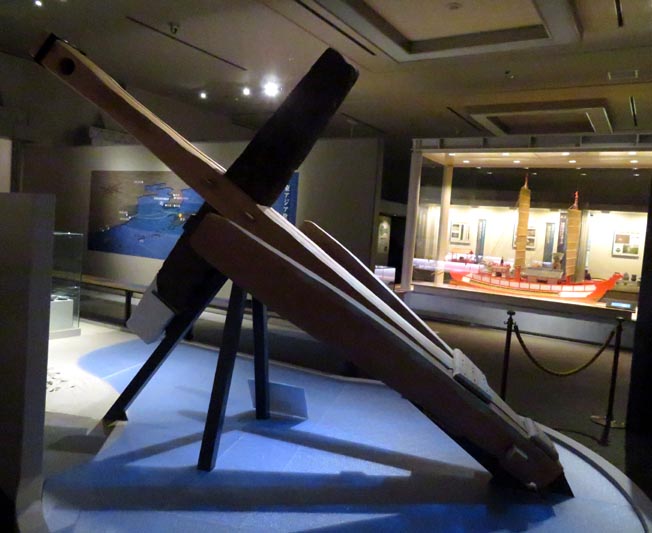 昭和7(1932)年、博多港中央埠頭の西200m、水深5mから引き揚げられた碇石(木組みは復元)。石材は凝灰岩質砂岩で、一端を