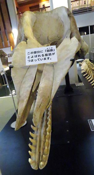 マッコウクジラは、ハクジラ(歯鯨)の仲間である。博物館の説明板によれば、成長するとオスの体長は18メートル、メスのそれは12メートル
