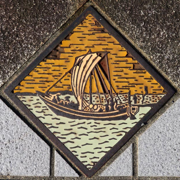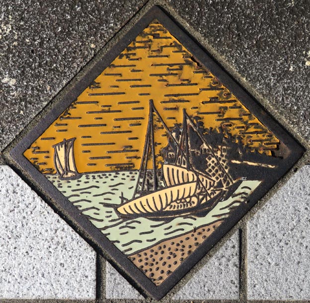 進む。その歩道には数十メートルごとに、画像1に写るような七里の渡し舟風景などをモチーフにしたマンホール蓋や、画像2・3のような金属プレート