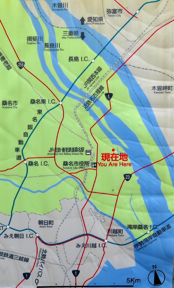 近鉄名古屋線の「桑名駅」から「八間通り」沿いに歩道を東方面へ真っ直ぐに、「桑名の渡し史跡 (Kuwana-no-Watashi Old Port)」を目指し
