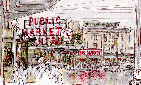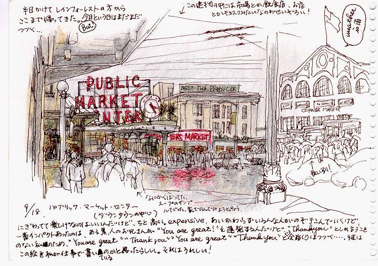 1 米国ワシントン州シアトルのダウンタウンにあるパイク・マーケット。魚貝類・野菜・果物を売る市民の台所である。
