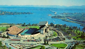米国ワシントン州シアトルにあるワシントン大学キャンパス内にあるアメリカンフットボール・スタジアム。背後に見えるのは