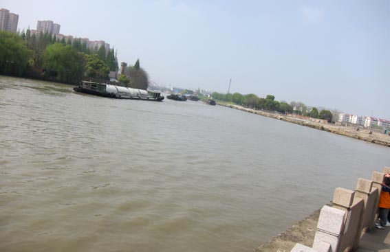 5. 中洲の最北端 (惊鴻渡) から京杭大運河を眺望する。数珠つなぎで艀(はしけ)が行き交う。